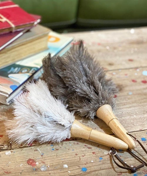 ダチョウの羽は静電気を帯びにくい性質があり、ダスターとして使えばホコリも静電気も取り除くことが出来る優れた素材です。室内観葉植物の葉のホコリ取りなどにも最適なサイズ感です。そこに同じく天然素材のバンブーハンドルを合わせたら、見た目も実用性もハイレベルのフェザーダスターになりました。羽のカラーはGRAYとWHITEの2カラー展開です。