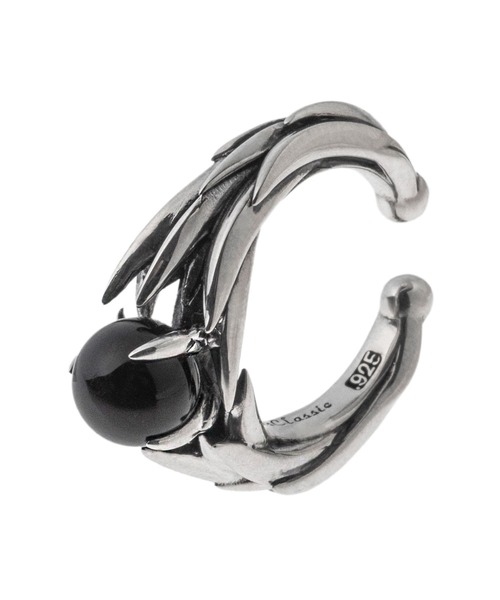 刺々しいエッジの彫り込みが躍動感溢れるイヤーカフ。丸く黒い石はオニキス。銀と石の美しさをバランス良く融合させたデザイン。細かく繊細に彫り込んだデザインで、丁寧に造られた精巧な作りが魅力。ピアスのようにホールをあける必要もなく、耳に挟むだけで簡単に装着でき、耳元をお洒落に魅せてくれます。