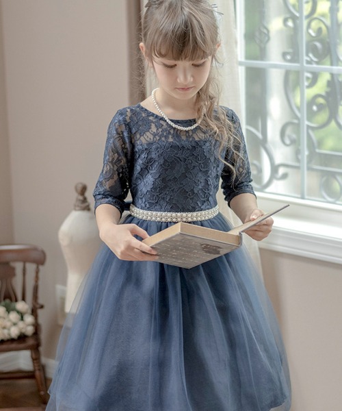 ウエストパールが上品に輝く人気の透かしレースドレスに、