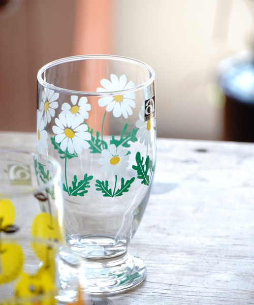 ・その他4/花ざかり…名前の通りグラス一面に咲きこぼれたマーガレットが華やかなシリーズ。お花畑のような柄はテーブルに置くだけで明るく、楽しそうに見えます。花ざかりが最初に発売されたのは昭和46年。当時は琥珀色のグラスと、無色透明のグラスにプリントされた2種類が生産されていました。