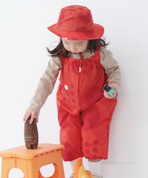 撥水加工で雨の日も使えるサロペット。お砂場遊びなど、お洋服を汚したくない時にも大活躍。持ち運びに便利な収納巾着付き。