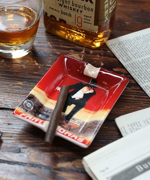 まさしく海の向こうの異国が得意とするアートが、はみ出さんとばかりに描かれた灰皿。レトロなポスターをそのまま小さくした様な主張の強い存在感は、数個並べてケンカさせたい程。タバコを吸わないのなら、コイントレイやアクセサリートレイとしても◎。古き良き時代感が漂います。