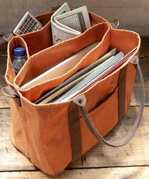 働く人に使って欲しい、必要なもの一式を詰めて移動できるバッグ。 仕切りがあり、ボトルホルダーも付いているので、PCや周辺機器、ペンやノート、水筒やペットボトルを分けて収納できます。 サイドに付属するDカンに市販のストラップを取り付ければ、ショルダータイプとしても使用可能。カラビナ付きの鍵やお気に入りのキーホルダーを付けるのも◎。16オンスの丈夫なワックスキャンバス素材、程よい収容力で、「日頃からガシガシ使い倒したい。」そんな気持ちが湧き出てきます。内側にさり気なく施されたタグもポイント。ついつい色違いで持ちたくなる、選べる3カラー展開。