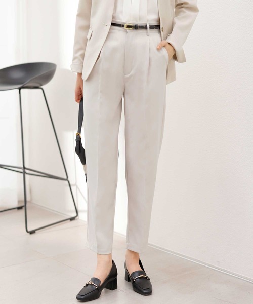 適度なゆとりを生むワンタックが腰回りをカバーしつつ、センタープレスがきちんと感を演出。きれいなテーパードラインとヒップ位置を高く見せる後飾りポケットで、スタイルアップ効果も期待できそう。