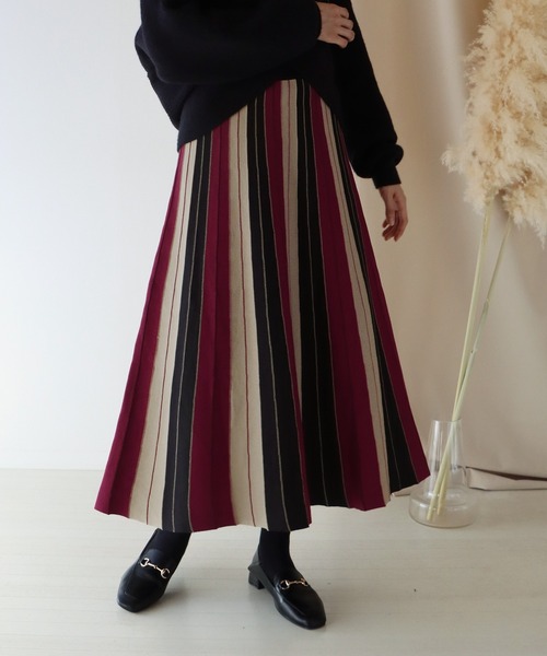 マルチカラーのストライプ柄を配色したおしゃれ見えするニットスカート。