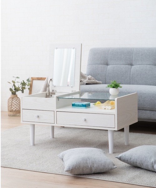 Point.1ドレッサーとテーブルの1台2役そのまま使えばセンターテーブルとして、天板を開けばドレッサーに早変わり。