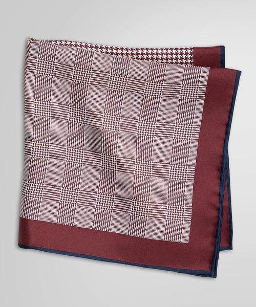コーディネートを彩るポケットスクエア(ポケットチーフ)光沢感のあるシルクツイル地を用い、トラディショナルなハウンドトゥース、ドット、グレンチェック、ヘリンボーン、4つの柄をプリントし、ソリッドカラーで囲みました。たたみ方次第で様々な表情を演出します。高級感のあるハンドロールで細く手まつりで仕上げたコントラストカラーの縁がアクセントに。