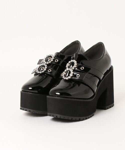 ビジュー装飾の2連ベルトがアクセントになった厚底チャンキーヒールのラウンドトゥブーティ。