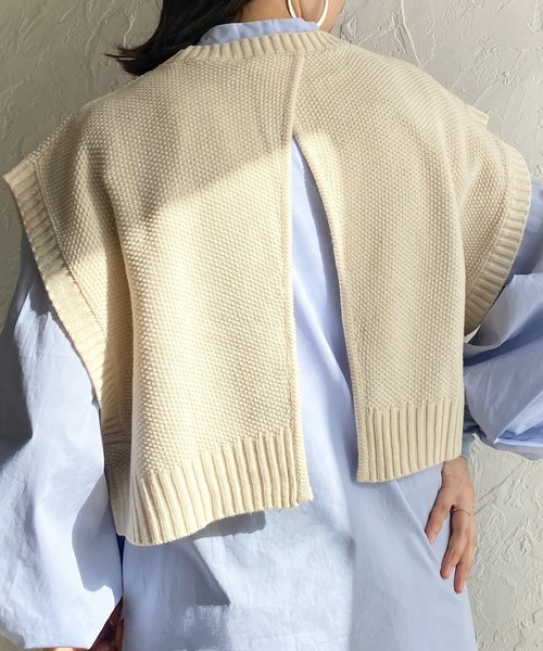 ◆スリットのようなクロスデザインが可愛い、前後2wayのショート丈袖なしニットベスト◆