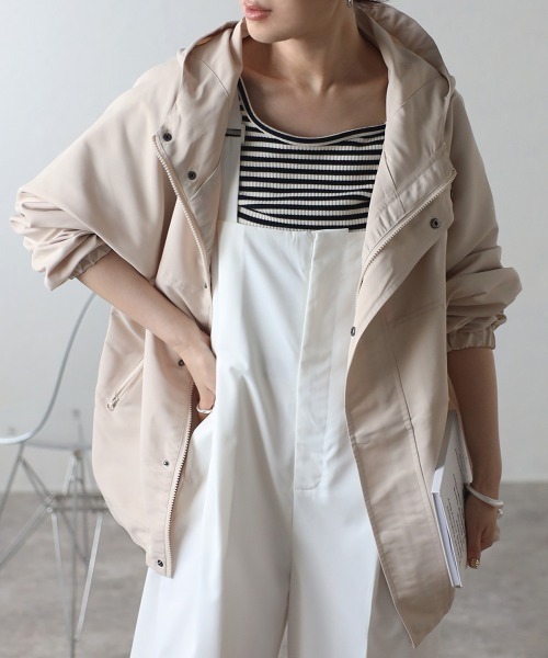 ◆季節の変わり目に活躍するライトアウター◆《ディテール》腰周りをカバーしてくれるミドル丈のマウンテンパーカー。ゆったりとしたラグランスリーブは厚手のトップスもINしやすいのが嬉しいポイントです。後ろ下がりのシルエットが女性らしい雰囲気に。袖口はギャザーになっているので捲りやすく、外気の侵入を防いでくれます。フードと裾はコードを絞ることで広がりを調節可能です。