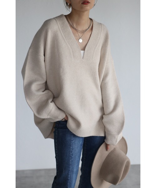 深めのVネック開きでオーバーサイズの抜け感のあるシルエット。