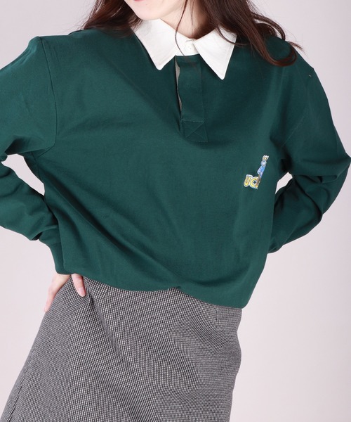 おしゃれなスクールロゴとカレッジモチーフのクマが刺繍されたラガーポロシャツです。