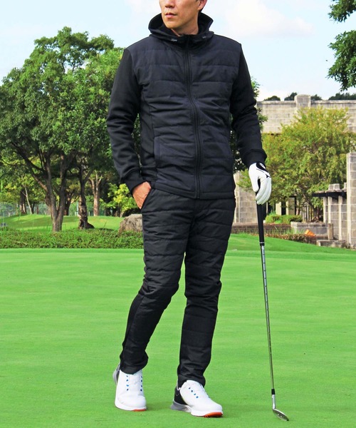 ダウンジャケットとダウンパンツのゴルフウェア上下セットアップスーツ。