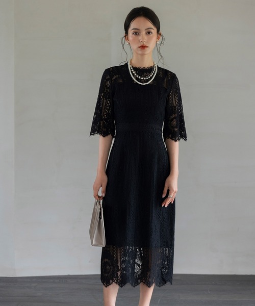 フラワー柄の総レースがエレガントなタイトシルエットのミモレ丈ワンピースドレス抜け感あるレース素材ながら、露出を抑えたクルーネックと5分袖で、大人女性にふさわしい落ち着きあるデザインに。もちろん裏地付きなので、インナーが透ける心配もありません。