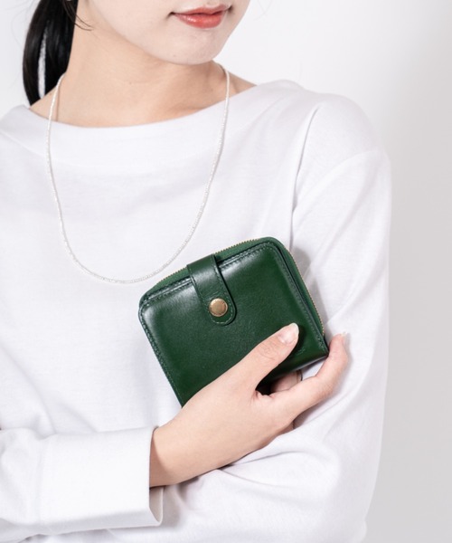 コンパクトな2つ折りタイプで、スナップボタンのデザインが目を引く魅力ある1品。