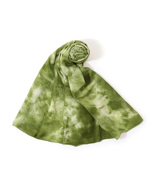 アトリエにて、手作業で絞り染を行うことで全体的に万遍なく柄が入ったストール。