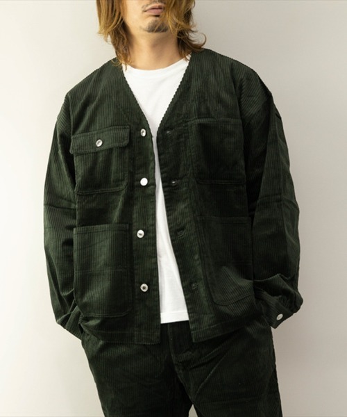 秋冬にぴったりの太畝コーデュロイ ノーカラー カバーオールジャケット。