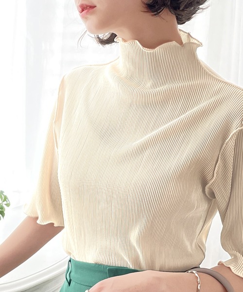 プリーツの陰影と絶妙な大人ハイネックが映えるトップス。