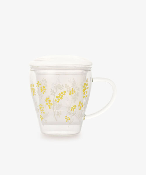 容器の中で茶葉を漉して、そのままお茶を飲める茶漉し付きの耐熱マグカップです。大人気の茶漉し付き耐熱マグカップが、愛らしいミモザのデザインで登場。中身が見えるクリアな素材を使用しているので、紅茶の色やハーブティーなどを目でも楽しむことができます。網目が細かく水切れ抜群のセレックのVフィルターを使用しており、金属製の茶漉しと比べて金属の味や香りが出ず、紅茶の味をそのまま堪能できるのが特長です。紅茶の蒸らしや中身がこぼれるのを防ぐのに役立つ蓋付き。容器は耐熱仕様になっているので、電子レンジにかけて冷めてしまったドリンクのあたため直しもできます。