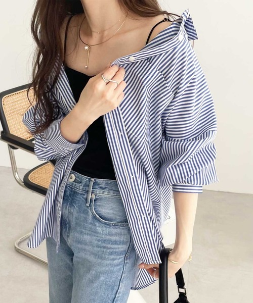 前ボタンを開けて羽織シャツとしてきるだけで、女性らしいカジュアルコーデが完成。
