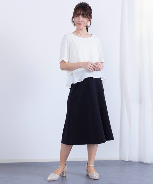 着回し力抜群のフリルトップスと上品な膝丈スカートがセットになった、2ピースセットアップです。
