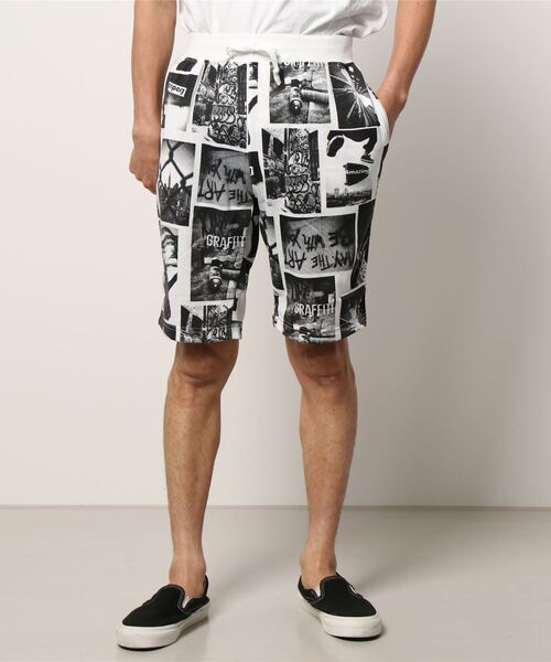 フォトプリントが目を引くミニ裏毛ショートパンツ。ウエストシャーリングでラフな着心地。