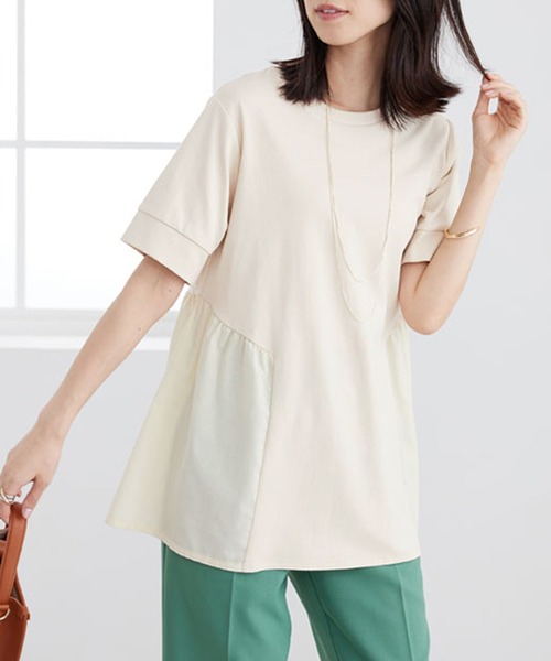 ウエスト下のサイド部分をシャツ生地で切り替えた