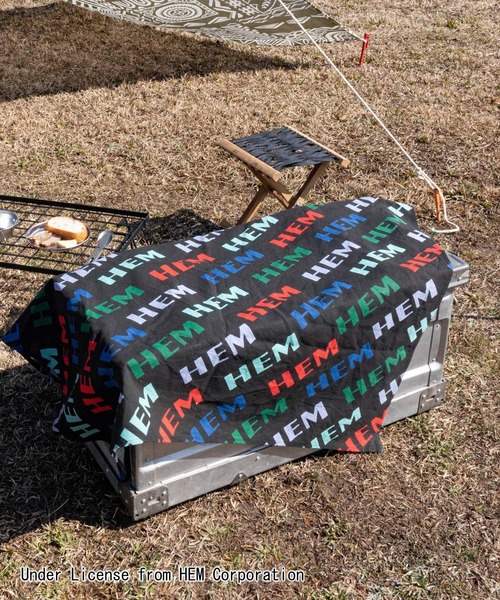 HEM社のロゴをカラフルにプリントした、約100cm角のマルチクロス。