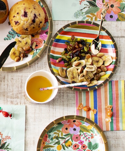 水彩画タッチのカラフルな柄でパーティーや女子会、ケータリングやピクニックなど、カジュアルな食事会にも華やかさをもたらすデザインです。