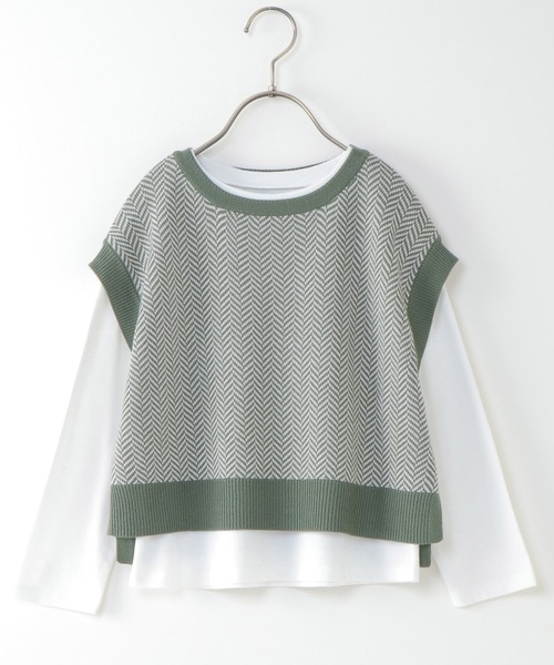 親子でお揃いコーデができる!コーデに迷わない!ベスト×インナーのセット♪ヘリンボーン柄のニットベスト+無地ロンTのアンサンブル!