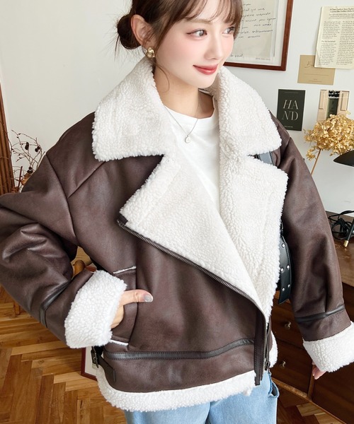 フェイクレザーのクールな雰囲気と、内側のボアフェイクムートンのふんわり感のデザインが可愛く、一枚で存在感のあるアウターです♪