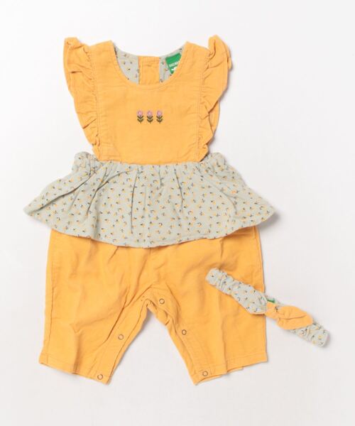 柔らかなシャツコールにフリルの花柄がとってもキュートなサロペット。ヘアバンドとセットで写真映え間違いなしのデザイン。プレゼントにもオススメです。