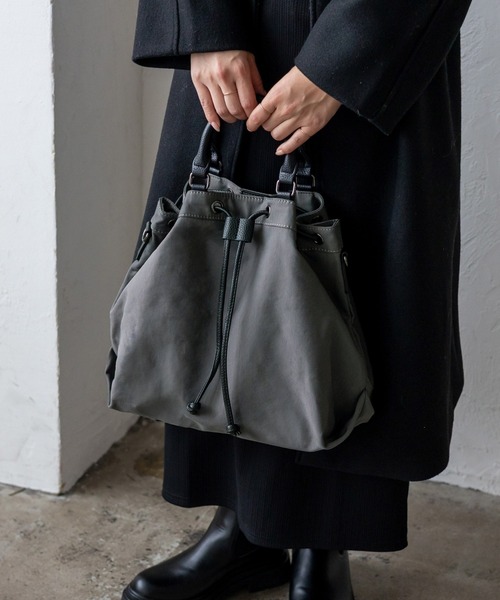 巾着の三角シルエットが印象的。持つだけでスタイリングにアクセントを添えるデザイン。