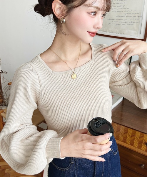 リブ編み/ニット/セーター/スクエアネック/ボリュームスリーブ/ボリューム袖/しっとり/もちもち/モチモチ/肌ざわり/着心地/シーズンムード/着回し/トレンド/旬