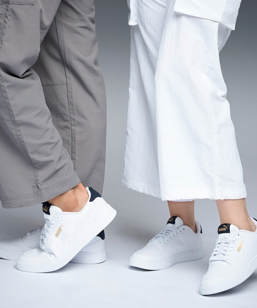 プーマ シャッフル パーフ スニーカーは、すっきりとしたシルエットと上質なタンブルレザーアッパーが魅力の、直営店限定モデル。両側面にはパーフォレーション(通気孔)加工が施されており、通気性に優れ、長時間の着用でもムレにくく快適です。インソールには、クッション性に優れた**SoftFoam+**を採用。足裏にやさしくフィットし、歩行時の衝撃をしっかり吸収します。また、ラバーミッドソールとアウトソールが高い耐久性とグリップ力を発揮し、安定した歩行をサポート。調整可能なシューレースでフィット感も自在に調整でき、軽量設計(約320g/27cm)で長時間の使用でも疲れにくいのもポイントです。デザイン面では、かかとのスウェードパッチやシュータン・サイドに施されたプーマロゴが、シンプルな中にもさりげないアクセントをプラス。カジュアルからきれいめまで幅広いスタイリングにマッチし、ご家族やパートナーとの色違いコーデにもおすすめです。