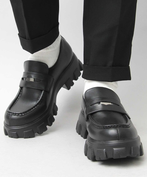 シンプルなコインローファーデザインのアッパーに、凹凸感とボリューム感が特徴のトラックソールを合わせて、ラグジュアリーな雰囲気の厚底シューズに。