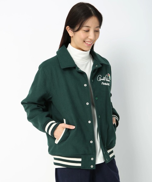 自信を持ってオススメする、こだわりが詰まったアーノルドパーマーオリジナルのスタジアムジャケット。ウール混のメルトン素材が軽さと暖かさを与えてくれ、コーディネートに季節感をプラスしてくれます。胸のアーノルドパーマーのモチーフが、インパクトのある仕上がりとなっています。ボリュームが出すぎないように薄く中わたを入れているので、スッキリした見た目ながら、しっかりと暖かく着用頂けます。サイズ感は細すぎず、ゆったりしすぎていないちょうどよいサイズ感で、どんなアイテムとも合わせやすいです。1枚で存在感のある仕上がりなので、シンプルなスウェットやニットと相性抜群です。