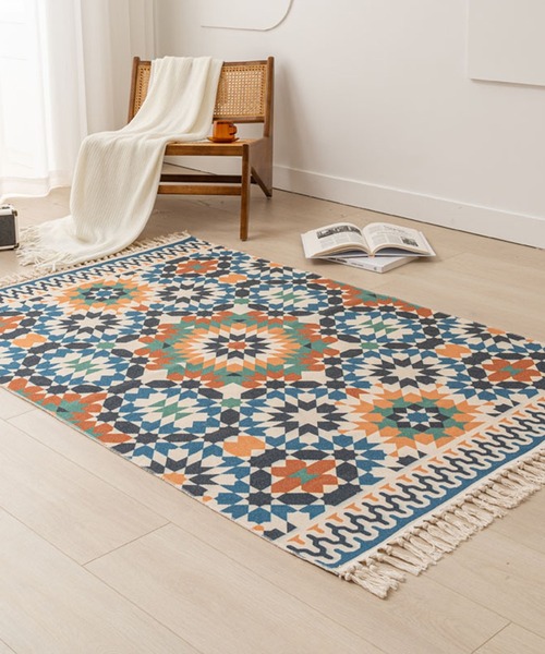 長いタッセル付きのオリエンタルな幾何学的デザイン。
