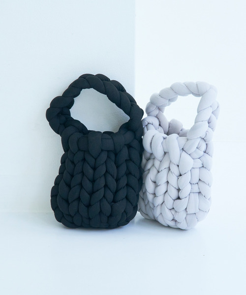 チャンキーニットを編み上げたざっくり感とコロンとした「餃子」形がかわいいハンドバッグ。