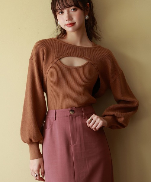 タンクトップ・クロップド丈ボレロの2点がセットになったカットアウトデザインのニットアンサンブル。