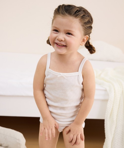 【素材】コンビミニの人気キャミソールは、無地見えなのにハート柄が入っている、伸縮性のある肌ざわりの良い綿100%アイレットフライスを使用。