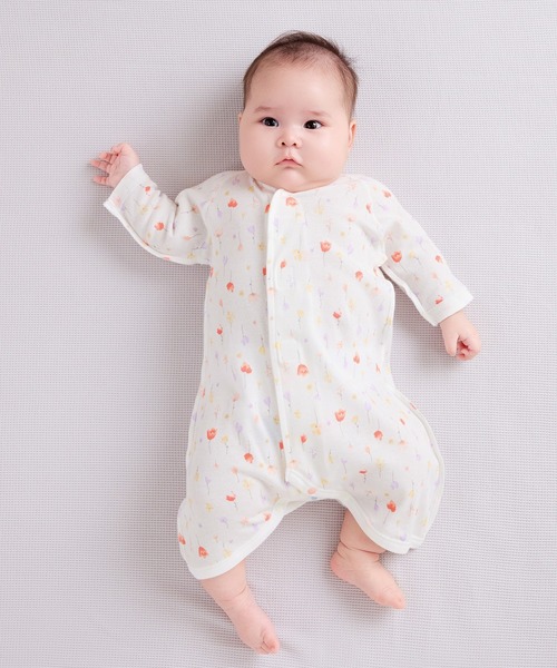 【仕様】「もっとかんたんにお着替えしたい」というママたちの声に応えて、ワンタッチテープ式のコンビ肌着が登場。足をバタつかせてもはだけない股下プランサー付きで、ワンタッチテープをさっとなでるだけで、素早くお着替えできます。内股中央のボタンは手ざわりと色を変えて、掛け違いを防止します。