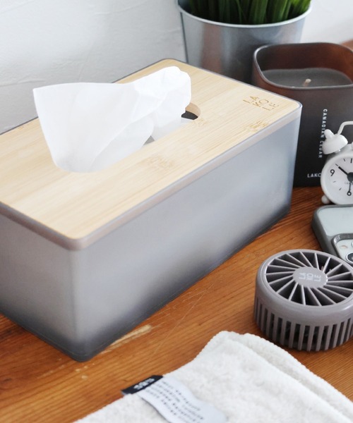 バンブー素材のフタと、すりガラスのような質感のプラスチックを組み合わせたティッシュケース。
