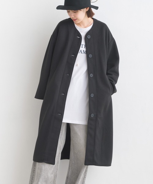 シンプルで使いやすいロングコートを縦キルティング生地で暖かくすっきりと仕上げました