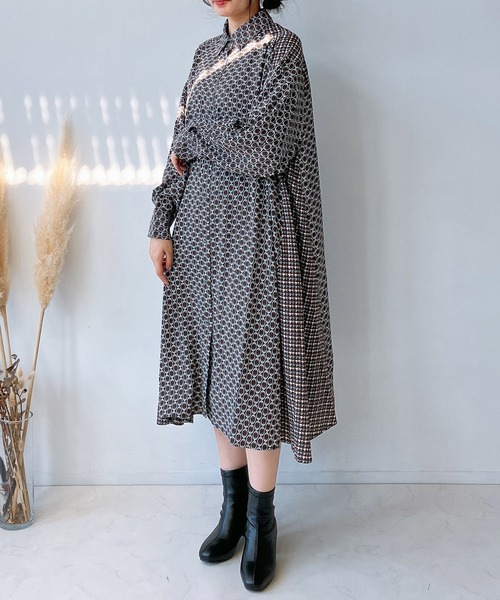 サイドの切替えがアクセントになった長袖シャツワンピース