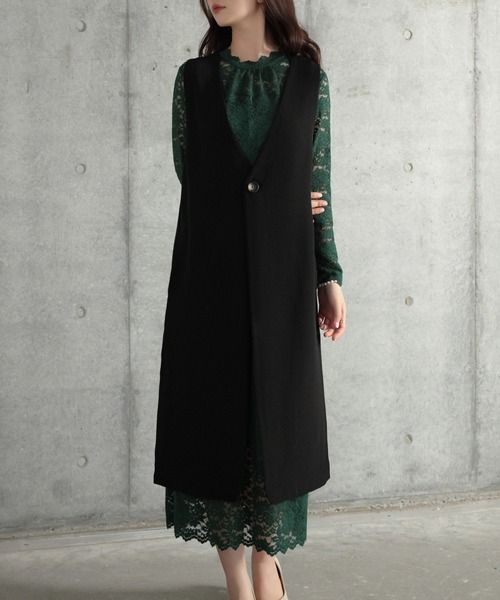 トレンドのノースリトレンチ風のロングコートとプチハイネックの総レース長袖ワンピースのセットマットで落ち着きのあるノースリーブコートとレーシーなワンピースの組み合わせが大人ムードたっぷり。それぞれ単品使いもでき、パーティーからカジュアルなお出かけまで幅広いシーンで活躍しますよ。■No-sleeve coatノースリーブのロングコートは、ボタンを閉めてレイヤードワンピース風にしても、前開きでばさっと羽織ってもスタイルが決まります。■Lace one pieceフィット感のあるタイトシルエットのミモレ丈ワンピース。シンプルなデザインでレースの華やかさが際立ちます。■Liningコート・ワンピースともに裏地がしっかり付いているので、着心地滑らか。インナーの透けも気にせず着用できます。