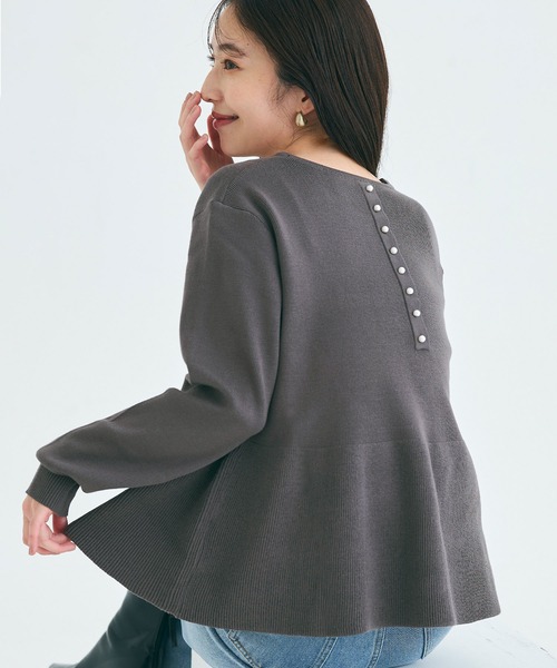 バックスタイルにさりげない華やかさを添える、パール付きフレアニットトップス