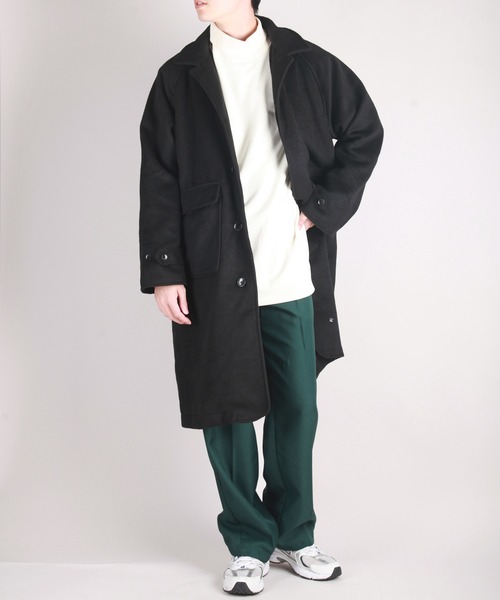 フロントの両サイドにあしらわれた大きめのポケットが目を引くロングチェスターコート。