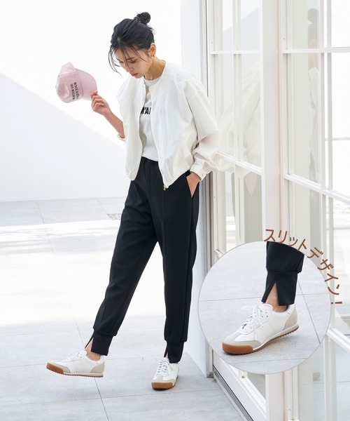 裾はリブデザインですぼまったシルエットを生み出します。更に前側に入ったスリットですっきり見えも叶えます。
