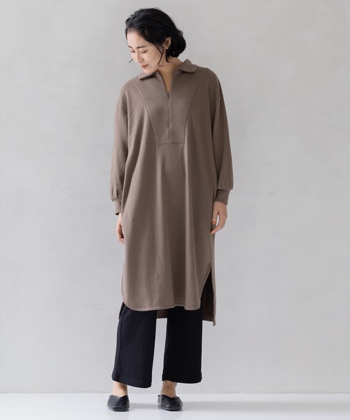 ロング丈のワンピースとワイドシルエットのリブパンツで、体を締め付けずラクな着心地。